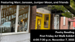 Marc Janssen, Juniper Moon, and friends like Eleanor Berry Poetry Reading: 6:00-7:30 p.m. with Open Mic, bring a poem! Manna 229 State Street, Salem, Oregon (Art Walk Hours: 5:00-8:00 p.m.) Come and help us celebrate the First Friday Art Walk! For the months of October and November, Juniper’s work will be , ...EARLY BIRD SPECIAL: 2026 Next Generation Short Story AwardsAll Day