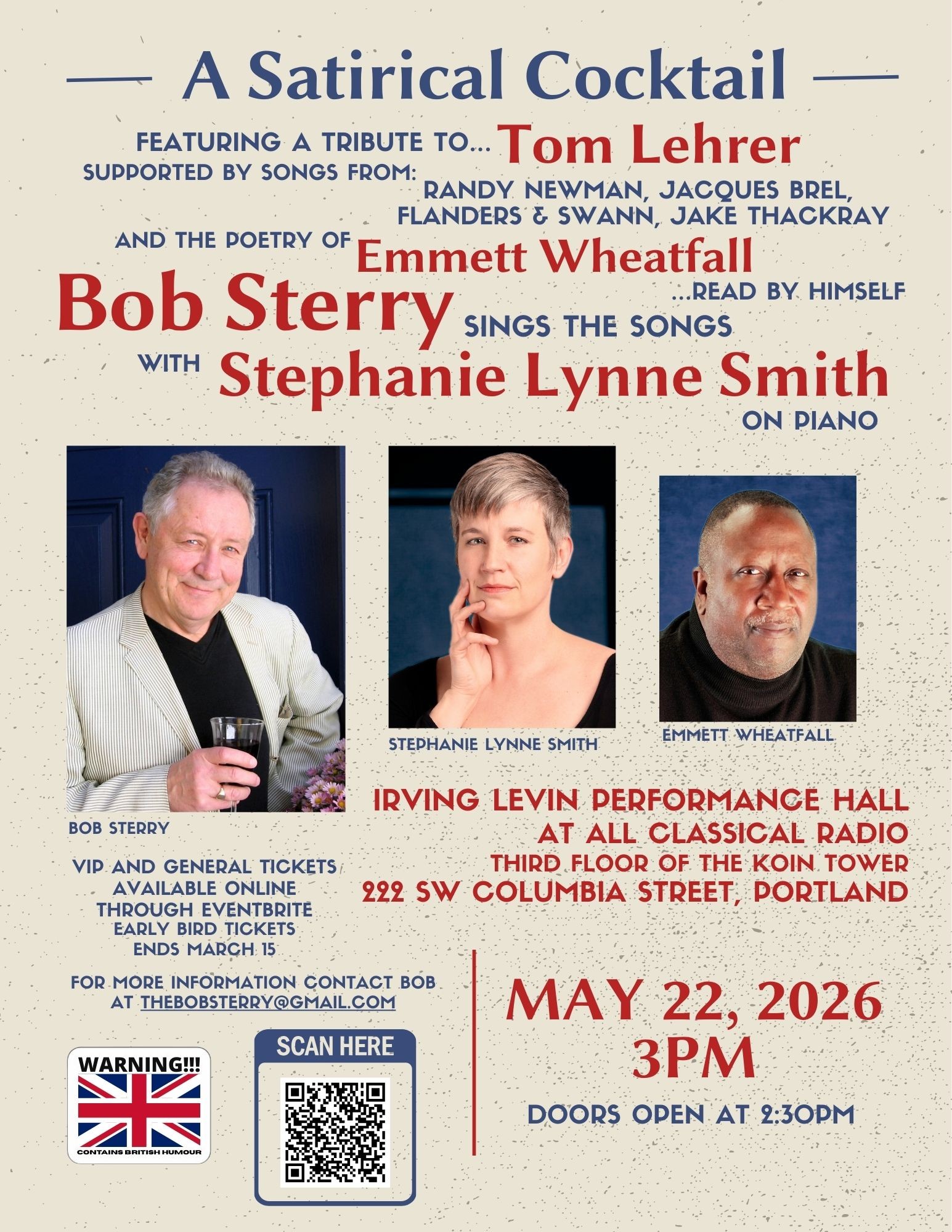 A performance of song and poetry as a Tom Lehrer tribute. Bob Sterry sings the songs, Emmett Wheatfall reads the poetry, Stephanie Lynne Smith accompanies on piano. Tickets available at Eventbrite. https://www.eventbrite.com/d/or–portland/a-satirical-cocktail/